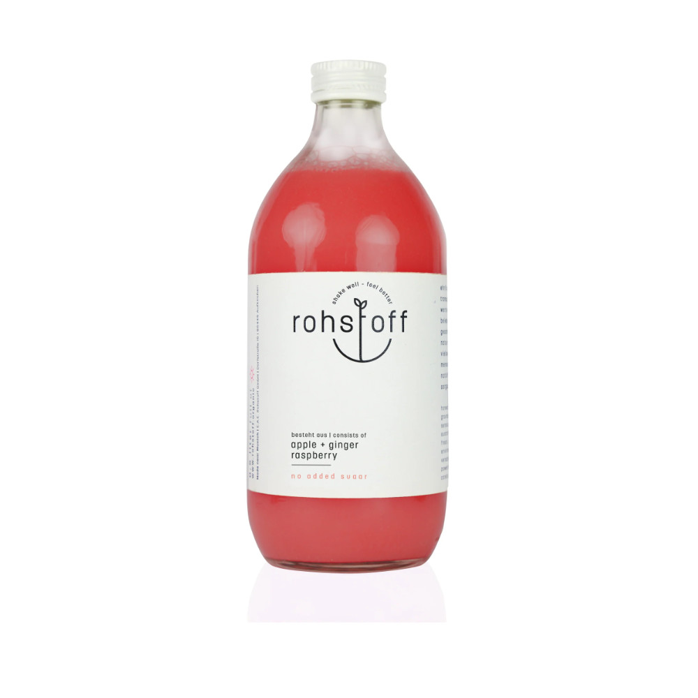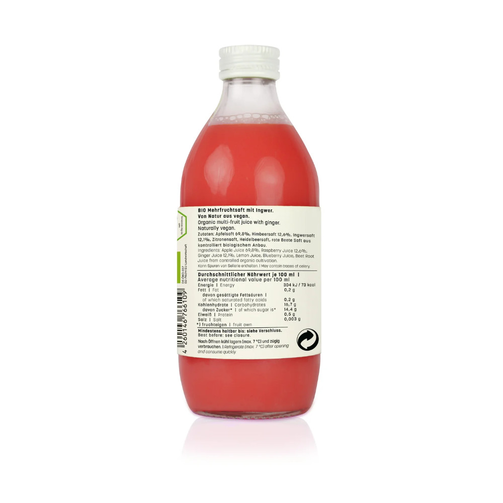 Zutaten: Apfelsaft 69,8%, Himbeersaft 12,6%, Ingwersaft 12,1%, Zitronensaft, Heidelbeersaft, rote Beete Saft