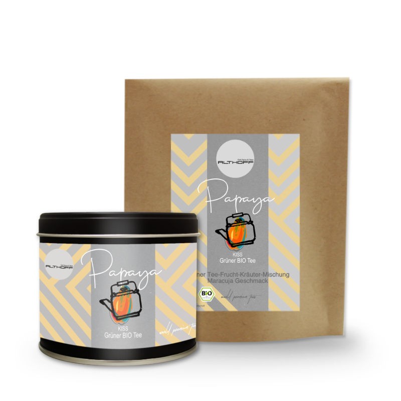 Papaya Kiss ist wie ein sonniger Urlaubsmoment – ein belebender grüner Tee, verfeinert mit tropischer Papaya, fruchtiger Maracuja und einem Hauch von Hibiskus. Die zarte Basis aus China Sencha bringt Leichtigkeit und feine Frische, während exotische Früchte und Kokos eine sommerlich-sanfte Süße verleihen.